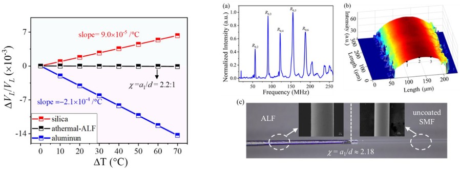 近日,公司董永康教授课题组在前向受激布里渊散射领域取得突破。研究成果以《绝热前向受激布里渊散射》(Athermal Forward Stimulated Brillouin Scattering)为题发表在《激光与光子学评论》(Laser Photonics Reviews)上。前向受激布里渊散射(Forward stimulatedBrillouin scattering, F-SBS)是一种非线性声光耦合效应,其通过横向共振声波独特的“由内至外”感知能力,在环境物质识别、能源勘探以及智慧医疗等领域展现出极大应用潜力。然而,在实际应用中,环境温度的波动会导致F-SBS中横向声波的共振频率发生显著漂移,其温度敏感性主要源自材料声速的热效应,严重制约F-SBS在温度敏感场景下的稳定性,并对高精度传感提出了严峻挑战。目前,现有技术难以从传感机理层面突破这一瓶颈。镀铝光纤中铝层厚度和包层半径的比例设计与表征绝热前向受激布里渊散射的实验结果针对这一技术难题,董永康教授课题组首次提出了绝热前向受激布里渊散射机制,通过理论建模、多物理场仿真以及实验验证的闭环研究,创新性地利用镀铝光纤解决了F-S